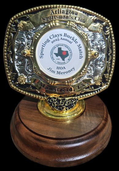 Customize a personal buckle for yourself or club by Emailing your camera ready logo or we have a gold layered breaking clay or Helice target we can use instead of a logo. custom made trophy buckle for 60.00.